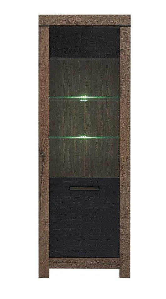 Простой стиль коллекции в цветовом решении дуб ансберг темный/ дуб болотный коричневый или сосна каньон/ дуб корабельный Отсутствие громоздких шкафов в наборе мебели отлично компенсируются функциональными витринами и большой тумбой РТВ. Стеклянные фасады и полки, подчеркнутые энергосберегающей светодиодной подсветкой, привлекают внимание.