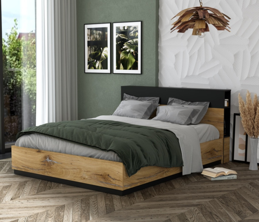 Головной щит кровати имеет открытые полки и откидную крышку с нишей для хранения.